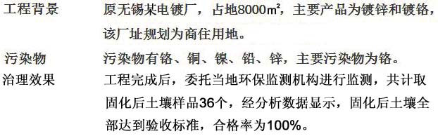 該項目場地為江蘇省無錫市的某電鍍廠原址,主要污染物為鉻及鎳、鉛、鋅等重金屬。因該項目重金屬污染樣式典型,被環(huán)保部列為2010年國家重金屬污染防治示范項目。江蘇大地益源環(huán)境修復有限公司于2011年3月至2011年9月,對該場地采取穩(wěn)定化/固化和化學淋洗等技術進行了污染土壤的修復治理。