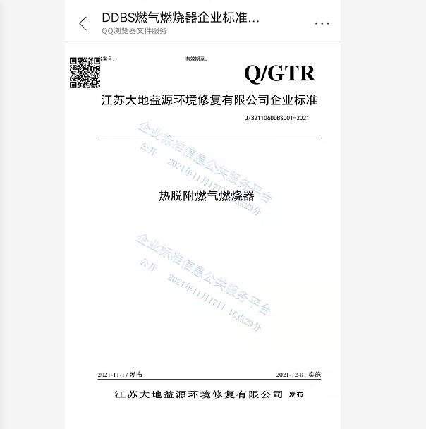 近期,企業產品標準公共服務平臺發布了由大地益源編寫的Q/321106ddbs001-2021《熱脫附燃氣燃燒器》企業標準。