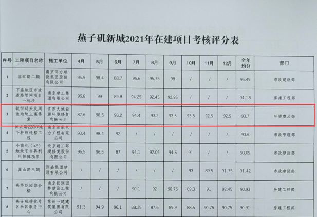 2022年3月10日,燕子磯新城開發建設指揮部召開“燕子磯新城2022年安全生產暨揚塵管控工作會議”,全面部署2022年安全工作,并依據2021年度在建項目的安全生產考核評分,對優秀企業進行表彰。由江蘇大地益源環境修復有限公司負責實施的毓恒碼頭及周邊地塊修復項目得分93.7,在參評的19家單位中位列第三,受到新城指揮部的表彰嘉獎。