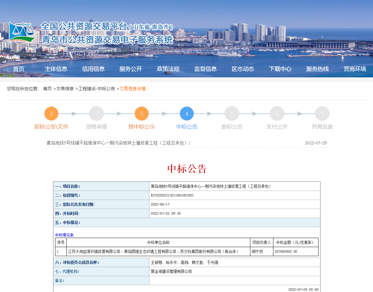 日前,山東省青島市政務服務和公共資源交易中心發布青島地鐵5號線鎮平路維保中心一期污染地塊土壤修復工程(工程總承包)中標公告。公告顯示,由大地益源環境修復有限公司組成的聯合體中標該項目,中標金額28786萬元。