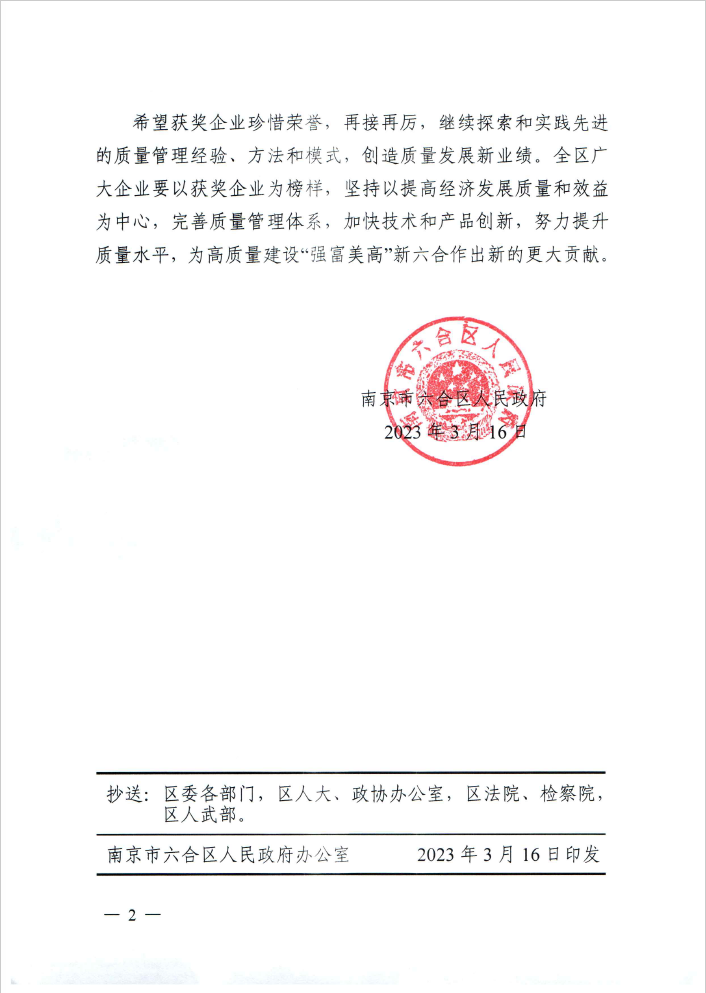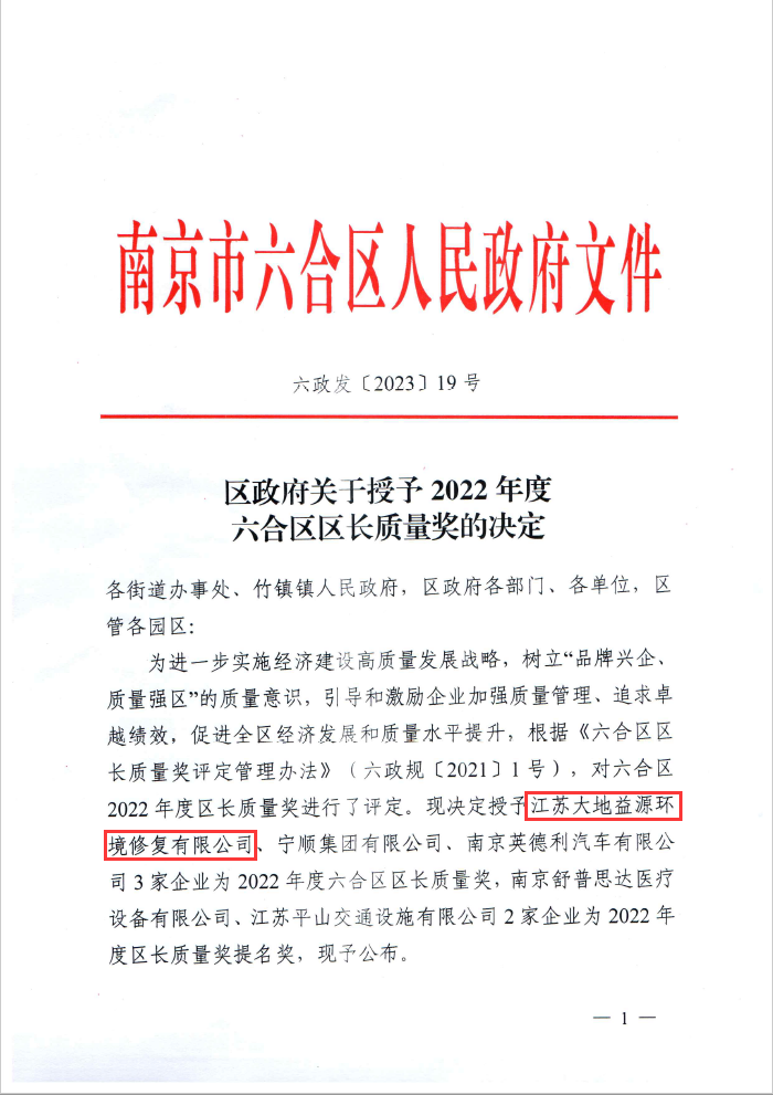 2022年3月16日,江蘇省南京市六合區人民政府印發了《區政府關于授予2022年度六合區區長質量獎的決定》,江蘇大地益源環境修復有限公司在眾多申報企業中勝出,榮獲“六合區區長質量獎”。