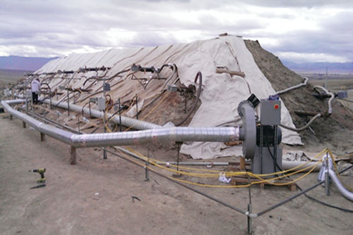 采用異位GTR ®修復技術對加州某場地的污染土壤進行修復。目標污染物是石油烴,最大濃度為31900mg/kg,平均濃度為9645mg/kg。修復土方量約20000立方米,每個土堆大小為124 x38 x 14英尺,休止角為大約40度。設置了36口加熱井,目標加熱溫度為200℃,加熱45天達到<100mg/kg的修復目標,去除率大于90%。
